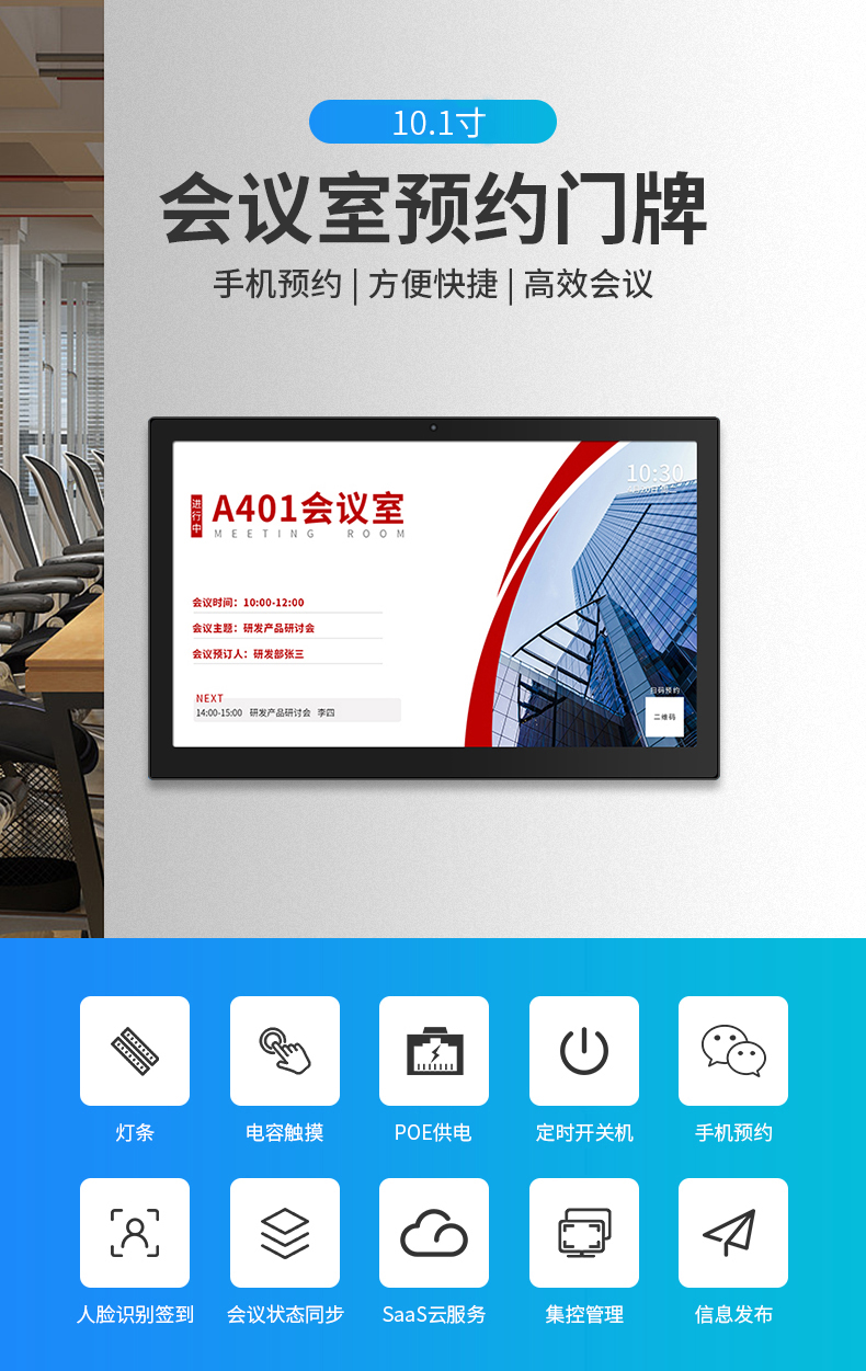 10.1 寸超薄会议室预约门牌:电容触摸、定时开关机、手机预约、人脸识别签到、会议状态同步、SaaS 云服务、信息发布