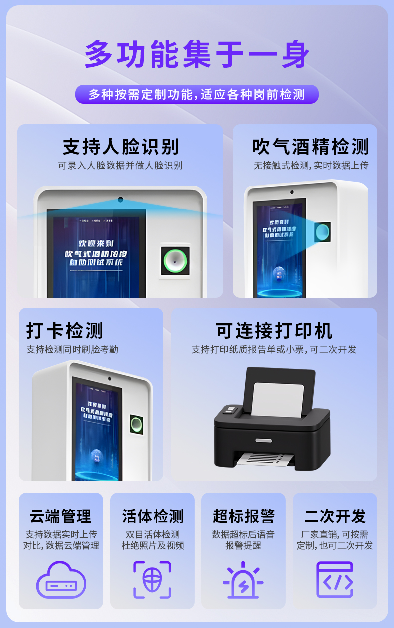 【产品功能】支持人脸识别、无接触式检测、实时数据上传、可链接打印机、超标警告。