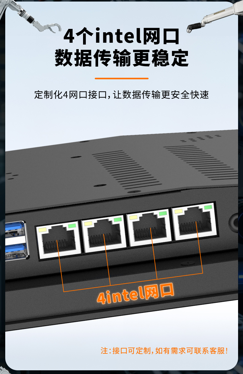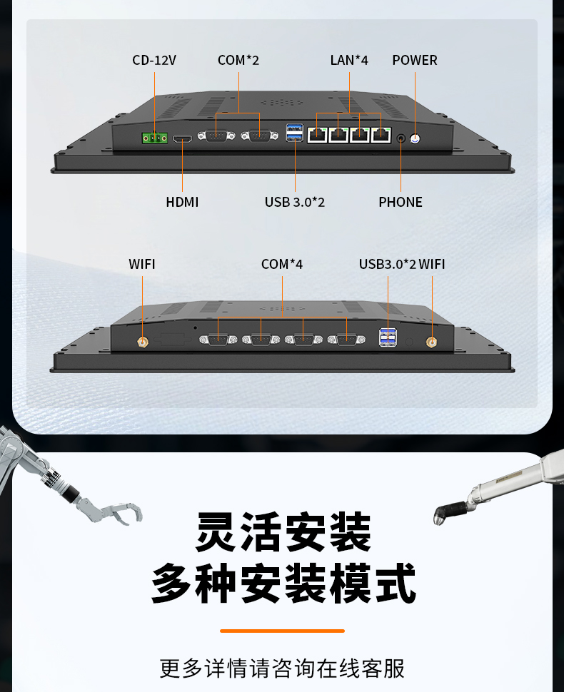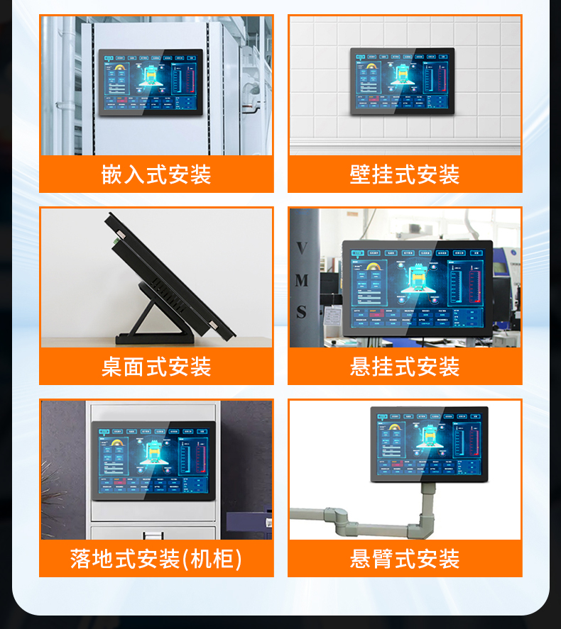 【可选配置】可选 Poe 功能 +90,4*RJ45/4*USB/2*COM【安装方式】嵌入式安装、壁挂式安装、桌面式安装、悬挂式安装、落地式安装(机柜)、悬臂式安装。